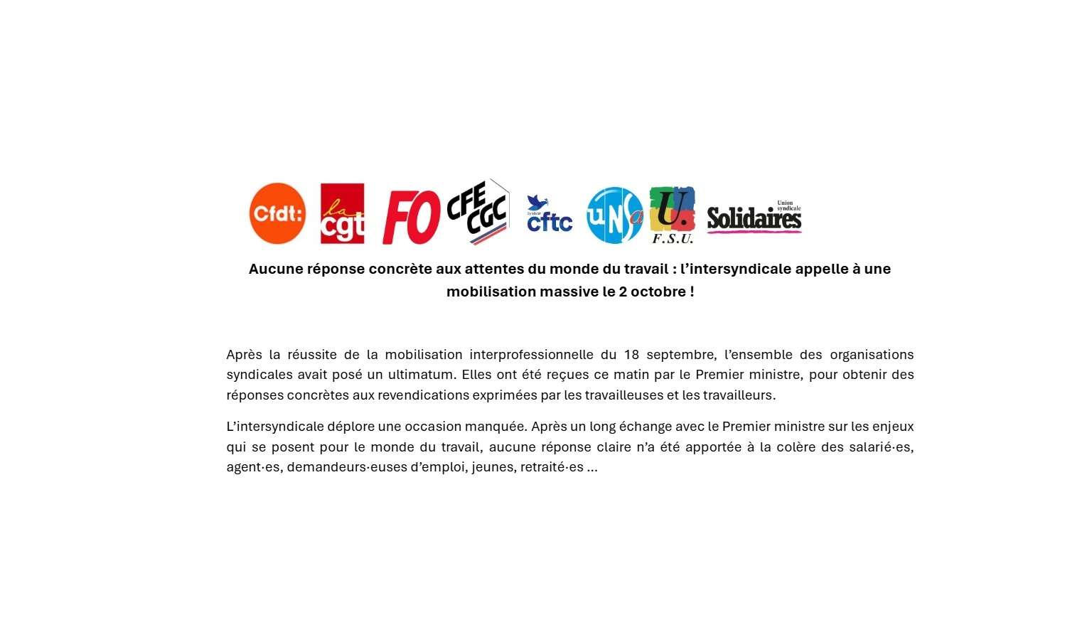 Les sacrifices pour le monde du travail, ça suffit ! A l'appel de FSU, CFDT, CGT, CGT-FO, CFE-CGC, CFTC, UNSA, SOLIDAIRES, TOUTE SEPTEMBRE S ET TOUS EN GREVE ! JEUDI 2 octobre 2025 Où manifester en région Hauts-de-France ? Abbeville, 9h45, devant le lycée Boucher de Perthes Amiens, 13h, Citadelle Beauvais, 14h, devant la préfecture de l'Oise Boulogne sur Mer, 10h, Bourse du travail, 6 rue d’Artois [...]